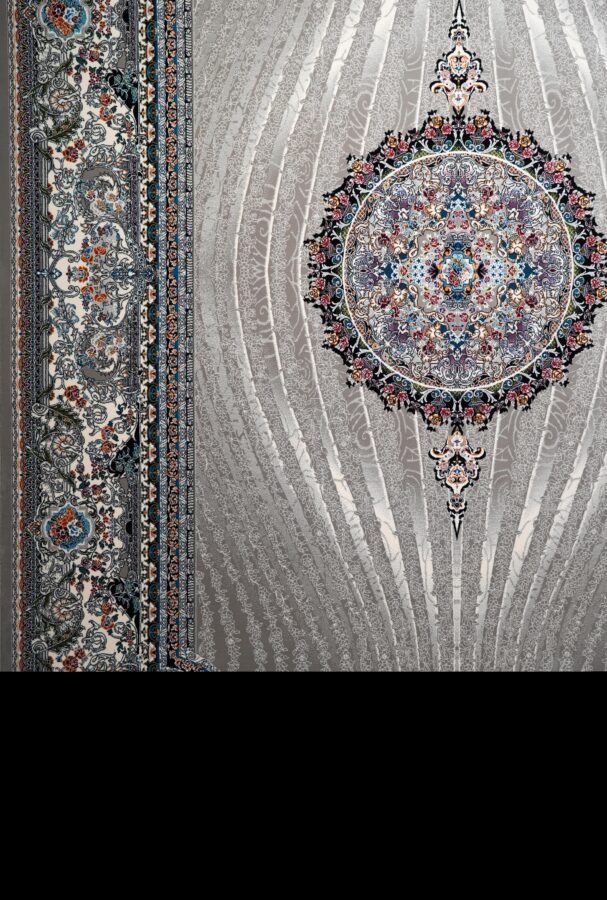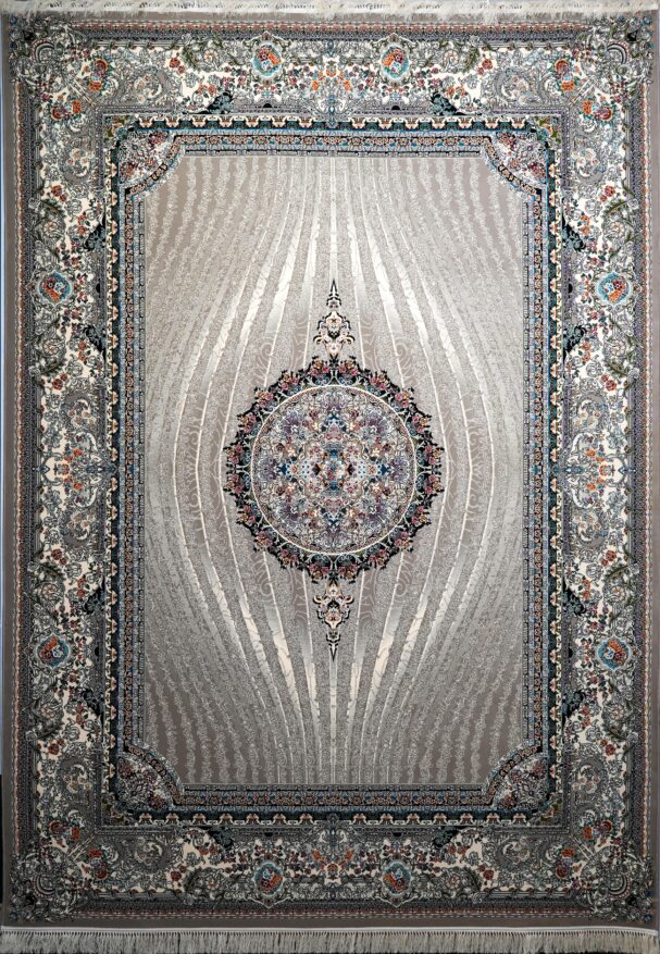 The luminous beige-silver field is enriched with delicate multicolor accents, creating a harmonious balance of softness and sophistication. Its finely embossed texture enhances visual depth, while the plush