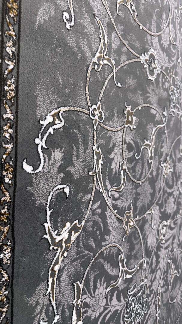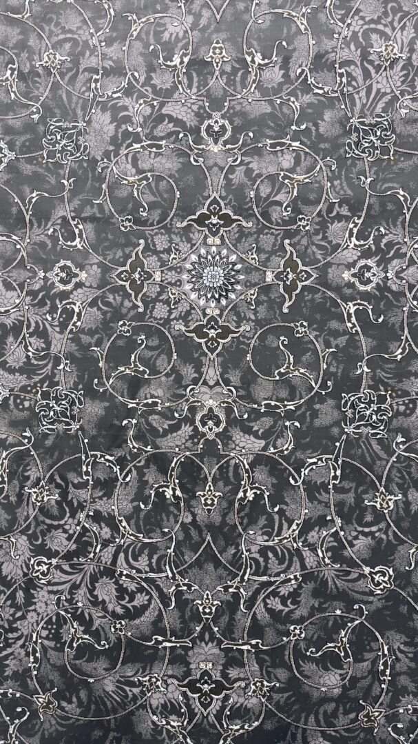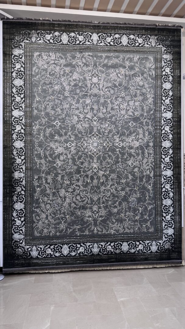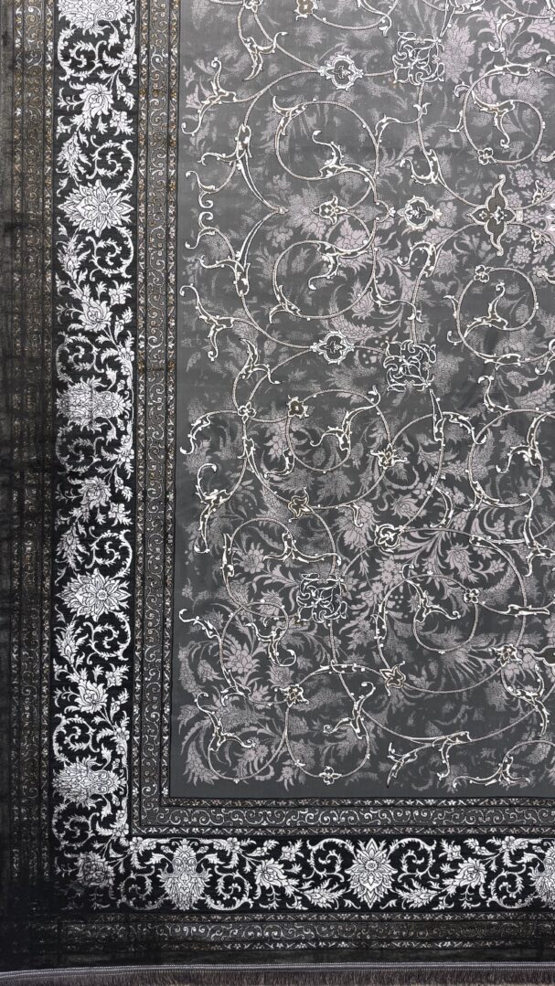 Bring timeless sophistication to your interior with this beautifully crafted rug from the Negin Itminan Mashhad Collection. Made in Iran, it showcases an intricate all-over floral vine pattern framed by a finely detailed border. The embossed design enhances texture and depth, while its generous pile height offers exceptional softness and comfort underfoot. The deep charcoal background combined with subtle silver-grey accents delivers a classic yet contemporary look, perfect for elevating any space.